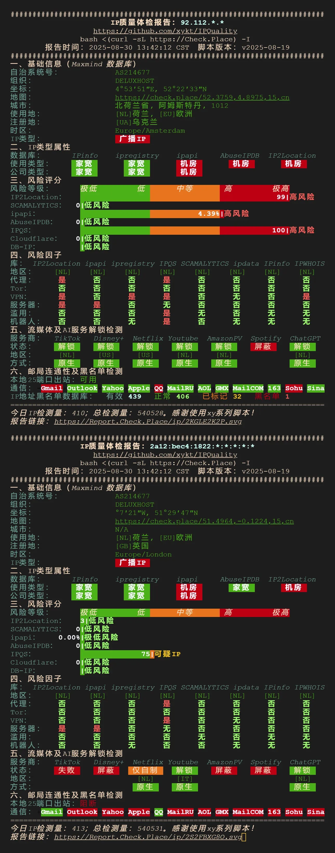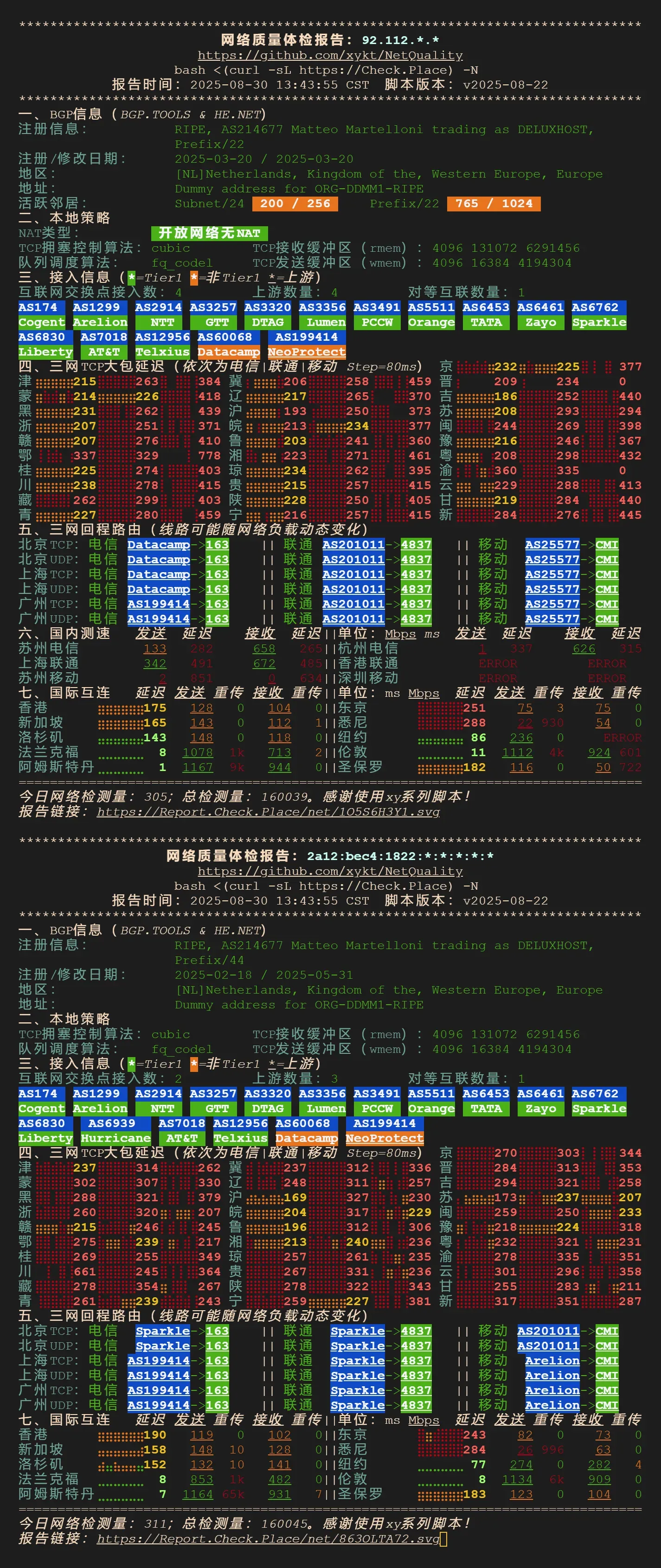 💻 基本信息 1 2 3 4 5 6 7 8 9 10 11 12 13 14 15 16 17 18 19 20 21 22 23 24 25 26 27 28 29 30 31 32 33 34 35 36 37 38 39 40 41 42 43 44 45 46 47 48 49 50 51 52 Basic System Information: --------------------------------- Uptime : 0 days, 0 hours, 10 minutes Processor : Intel(R) Xeon(R) Platinum 8173M CPU @ 2.00GHz CPU cores : 1 @ 1995.312 MHz AES-NI : ✔ Enabled VM-x/AMD-V : ✔ Enabled RAM : 1.9 GiB Swap : 1024.0 MiB Disk : 31.0 GiB Distro : Debian GNU/Linux 12 (bookworm) Kernel : 6.1.0-29-amd64 VM Type : STANDARD PC (I440FX + PIIX, 1996) IPv4/IPv6 : ✔ Online / ✔ Online IPv6 Network Information: --------------------------------- ISP : Matteo Martelloni trading as DELUXHOST ASN : AS214677 Matteo Martelloni trading as DELUXHOST Host : DELUXHOST Location : Amsterdam, North Holland (NH) Country : The Netherlands fio Disk Speed Tests (Mixed R/W 50/50) (Partition -): --------------------------------- Block Size | 4k (IOPS) | 64k (IOPS) ------ | --- ---- | ---- ---- Read | 128.98 MB/s (32.2k) | 305.48 MB/s (4.7k) Write | 129.32 MB/s (32.3k) | 307.09 MB/s (4.7k) Total | 258.30 MB/s (64.5k) | 612.57 MB/s (9.5k) | | Block Size | 512k (IOPS) | 1m (IOPS) ------ | --- ---- | ---- ---- Read | 282.12 MB/s (551) | 283.41 MB/s (276) Write | 297.11 MB/s (580) | 302.29 MB/s (295) Total | 579.24 MB/s (1.1k) | 585.71 MB/s (571) Geekbench 5 Benchmark Test: --------------------------------- Test | Value | Single Core | 490 Multi Core | 479 Full Test | https://browser.geekbench.com/v5/cpu/23754752 SysBench CPU 测试 (Fast Mode, 1-Pass @ 5sec) --------------------------------- 1 线程测试(单核)得分: 805 Scores SysBench 内存测试 (Fast Mode, 1-Pass @ 5sec) --------------------------------- 单线程读测试: 16436.80 MB/s 单线程写测试: 13306.84 MB/s