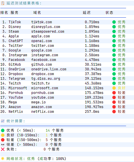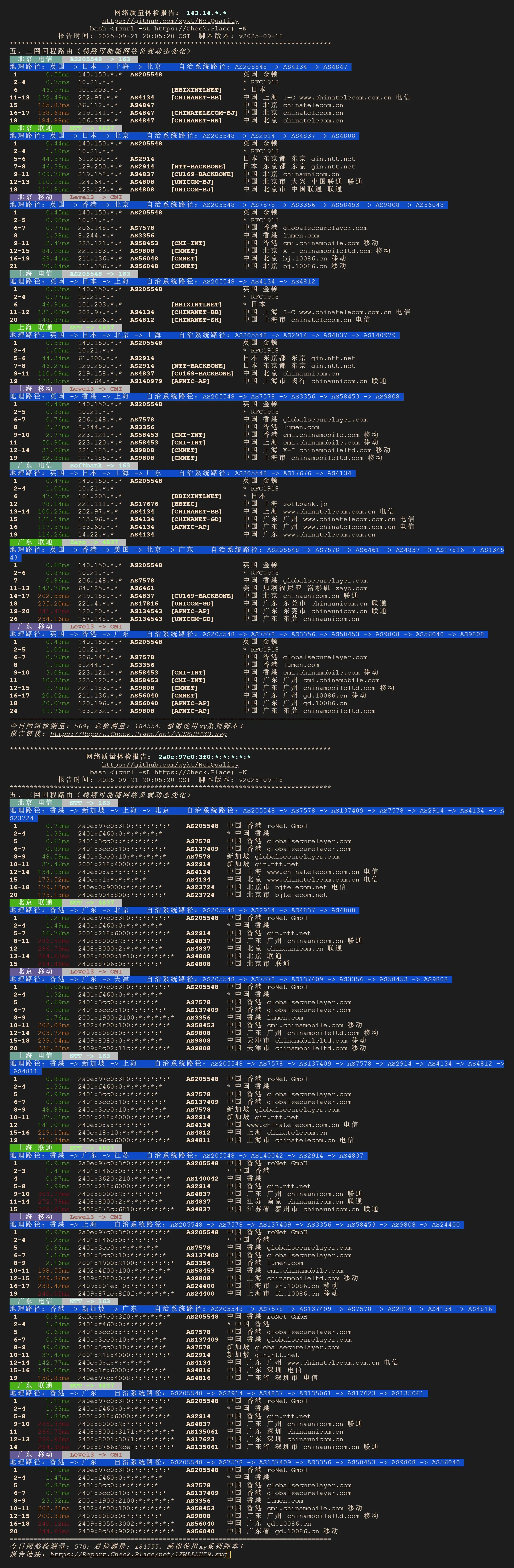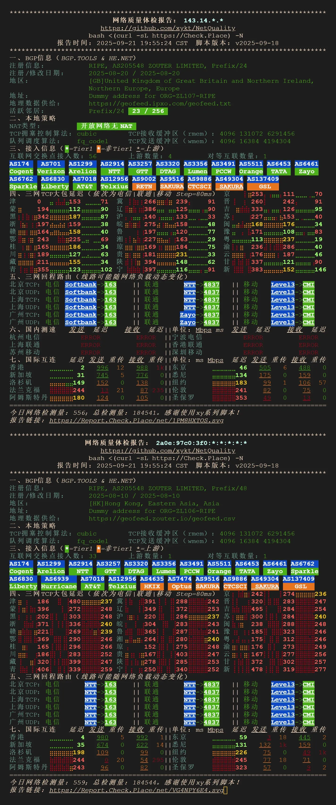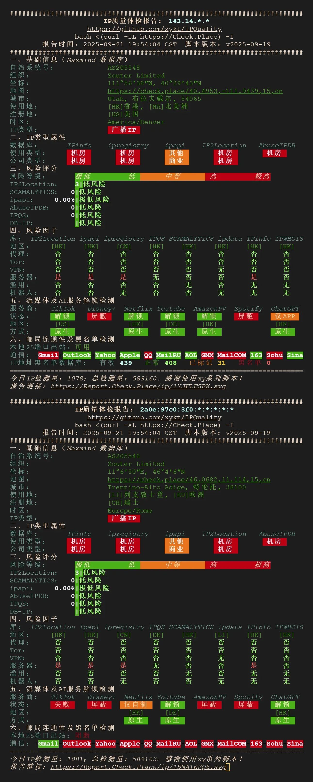 | -------------------------------------VPS融合怪测试------------------------------------- 版本:v0.1.87 测评频道: https://t.me/+UHVoo2U4VyA5NTQ1 Go项目地址:https://github.com/oneclickvirt/ecs Shell项目地址:https://github.com/spiritLHLS/ecs --------------------------------------系统基础信息-------------------------------------- CPU 型号 : Intel(R) Xeon(R) Platinum 8269CY CPU @ 2.50GHz CPU 数量 : 2 Virtual CPU(s) CPU 缓存 : L1: 64 KB / L2: 1 MB / L3: 35 MB AES-NI : ✔️ Enabled VM-x/AMD-V/Hyper-V : ✔️ Enabled 内存 : 664.71 MB / 1.93 GB 气球驱动 : ✔️ Enabled 内核页合并 : ❌ Undetected 虚拟内存 Swap : 395.68 MB / 2.00 GB 硬盘空间 Disk 1 : 84.13 GB / 983.23 GB [8.6%%] /dev/vdb1 - /opt/disk 硬盘空间 Disk 2 : 5.48 GB / 14.66 GB [37.4%%] /dev/vda1 - / 启动盘路径 : /dev/vda1 系统 : debian 12.12 [x86_64] 内核 : 6.1.0-39-cloud-amd64 系统在线时间 : 1 days, 17 hours, 25 minutes 时区 : CST 负载 : 0.40 / 0.14 / 0.04 虚拟化架构 : KVM NAT类型 : Port Restricted Cone TCP加速方式 : cubic IPV4 ASN : AS205548 ZOUTER LIMITED IPV4 Location : Kwai Chung / Kwai Tsing / HK IPV4 Active IPs : 1/256 (subnet /24) IPV6 ASN : AS205548 ZOUTER LIMITED IPV6 Location : Hong Kong / HK IPv6 子网掩码 : /64 --------------------------------CPU测试-通过sysbench测试-------------------------------- 1 线程测试(单核)得分: 1040.01 2 线程测试(多核)得分: 1965.05 --------------------------------内存测试-通过sysbench测试--------------------------------- 单线程顺序写速度: 17718.85 MB/s(18.58K IOPS, 5s) 单线程顺序读速度: 21113.97 MB/s(22.14K IOPS, 5s) -----------------------------------硬盘测试-通过fio测试----------------------------------- 测试路径 块大小 读测试(IOPS) 写测试(IOPS) 总和(IOPS) /root 4k 72.05 MB/s(18.0k) 72.24 MB/s(18.1k) 144.30 MB/s(36.1k) /root 64k 1.21 GB/s(18.9k) 1.22 GB/s(19.0k) 2.43 GB/s(37.9k) /root 512k 1.24 GB/s(2415) 1.30 GB/s(2543) 2.54 GB/s(4958) /root 1m 1.22 GB/s(1191) 1.30 GB/s(1271) 2.52 GB/s(2462) /opt/disk 4k 6.01 MB/s(1501) 6.00 MB/s(1499) 12.01 MB/s(3000) /opt/disk 64k 95.41 MB/s(1490) 95.91 MB/s(1498) 191.32 MB/s(2988) /opt/disk 512k 498.02 MB/s(972) 524.48 MB/s(1024) 1.02 GB/s(1996) /opt/disk 1m 491.90 MB/s(480) 524.66 MB/s(512) 1.02 GB/s(992) -------------------------------------御三家流媒体解锁------------------------------------- ----------------Netflix----------------- [IPV4] 您的出口IP完整解锁Netflix,支持非自制剧的观看 NF所识别的IP地域信息:中国香港 [IPV6] 您的出口IP完整解锁Netflix,支持非自制剧的观看 NF所识别的IP地域信息:中国香港 ----------------Youtube----------------- [IPV4] 连接方式: Youtube Video Server 视频缓存节点地域: 中国香港(HKG07S42) [IPV6] 连接方式: Youtube Video Server 视频缓存节点地域: 中国香港(HKG07S42) ---------------DisneyPlus--------------- [IPV4] 当前IPv4出口所在地区即将开通DisneyPlus [IPV6] 当前IPv4出口所在地区即将开通DisneyPlus -------------------------------------跨国流媒体解锁-------------------------------------- IPV4: ============[ 跨国平台 ]============ Apple YES (Region: HKG) BingSearch YES (Region: HK) Claude YES Dazn Banned Disney+ NO (forbidden-location) Gemini NO GoogleSearch YES Google Play Store YES (Region: DE) IQiYi YES (Region: US) Instagram Licensed Audio YES KOCOWA NO MetaAI NO (GeoBlocked) Netflix YES (Region: US) Netflix CDN HK OneTrust YES (Region: HK KWAI TSING) ChatGPT YES (Only Available with Mobile APP) Paramount+ YES Amazon Prime Video YES (Region: HK) Reddit NO SonyLiv YES (Region: IN) Sora Banned (VPN Blocked) Spotify Registration NO Steam Store YES (Community Available) (Region: HK) TVBAnywhere+ YES (Region: HK) TikTok YES (Region: US) Viu.com YES Wikipedia Editability YES YouTube Region YES (Region: DE) YouTube CDN HKG --------------------------------------IP质量检测-------------------------------------- 以下为各数据库编号,输出结果后将自带数据库来源对应的编号 ipinfo数据库 [0] | scamalytics数据库 [1] | virustotal数据库 [2] | abuseipdb数据库 [3] | ip2location数据库 [4] ip-api数据库 [5] | ipwhois数据库 [6] | ipregistry数据库 [7] | ipdata数据库 [8] | db-ip数据库 [9] ipapiis数据库 [A] | ipapicom数据库 [B] | bigdatacloud数据库 [C] | dkly数据库 [D] | ipqualityscore数据库 [E] IPV4: 安全得分: 声誉(越高越好): 0 [2] 信任得分(越高越好): 0 [8] VPN得分(越低越好): 99 [8] 代理得分(越低越好): 100 [8] 社区投票-无害: 0 [2] 社区投票-恶意: 0 [2] 威胁得分(越低越好): 100 [8] 欺诈得分(越低越好): 0 [1 E] 滥用得分(越低越好): 0 [3] ASN滥用得分(越低越好): 0 (Very Low) [A] 公司滥用得分(越低越好): 0 (Very Low) [A] 威胁级别: low [9] 黑名单记录统计:(有多少黑名单网站有记录): 无害记录数: 0 [2] 恶意记录数: 0 [2] 可疑记录数: 0 [2] 无记录数: 95 [2] 安全信息: 使用类型: business [8] hosting [0 7] unknown [C] DataCenter/WebHosting/Transit [3] corporate [9] 公司类型: business [A] hosting [0 7] 是否云提供商: Yes [7] 是否数据中心: Yes [0 1 A] No [5 6 8 C] 是否移动设备: Yes [E] No [5 A C] 是否代理: No [0 1 4 5 6 7 8 9 A C E] 是否VPN: No [0 1 6 7 A C E] 是否Tor: No [0 1 3 6 7 8 A C E] 是否Tor出口: No [1 7] 是否网络爬虫: No [9 A E] 是否匿名: No [1 6 7 8] 是否攻击者: No [7 8] 是否滥用者: No [7 8 A C E] 是否威胁: No [7 8 C] 是否中继: No [0 7 8 C] 是否Bogon: No [7 8 A C] 是否机器人: No [E] DNS-黑名单: 315(Total_Check) 0(Clean) 5(Blacklisted) 24(Other) IPV6: 安全得分: 欺诈得分(越低越好): 0 [1] 滥用得分(越低越好): 0 [3] ASN滥用得分(越低越好): 0 (Very Low) [A] 公司滥用得分(越低越好): 0 (Very Low) [A] 安全信息: 使用类型: DataCenter/WebHosting/Transit [3] 公司类型: business [A] 是否