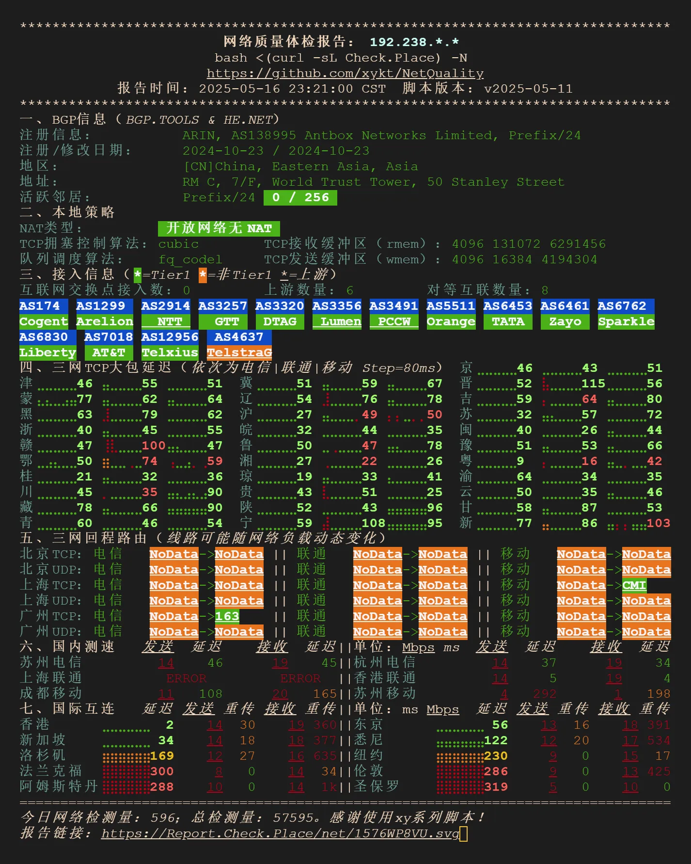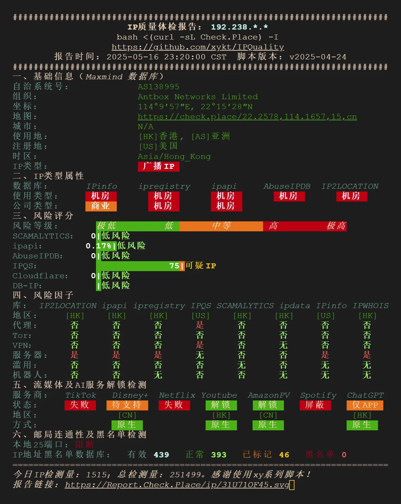 1 2 3 4 5 6 7 8 9 10 11 12 13 14 15 16 17 18 19 20 21 22 23 24 25 26 27 28 29 30 31 32 33 34 35 36 37 38 39 40 41 42 43 44 45 46 47 48 49 50 51 52 53 54 55 56 57 58 59 60 61 62 63 64 65 66 67 68 69 70 71 72 73 74 75 76 77 78 79 80 81 82 83 84 85 86 87 88 89 90 91 92 93 94 95 96 97 98 99 100 101 102 103 104 105 106 107 108 109 110 111 112 113 114 115 116 117 118 119 120 121 122 123 124 125 126 127 128 129 130 131 132 133 134 135 136 137 138 139 140 141 142 143 144 145 146 147 148 149 150 151 152 153 154 155 156 157 158 159 160 161 162 163 164 165 166 167 168 169 170 171 172 173 174 175 176 177 178 179 180 181 182 183 184 185 186 187 188 189 190 191 192 193 194 195 196 197 198 199 200 201 202 203 204 205 206 207 208 209 210 211 212 213 214 215 216 217 218 219 220 221 222 223 224 -------------------------------------VPS融合怪测试------------------------------------- 版本:v0.1.33 测评频道: https://t.me/vps_reviews Go项目地址:https://github.com/oneclickvirt/ecs Shell项目地址:https://github.com/spiritLHLS/ecs --------------------------------------系统基础信息--------------------------------------  CPU 型号            : Intel(R) Xeon(R) Gold 6138 CPU @ 2.00GHz  CPU 数量            : 4 Virtual CPU(s)  CPU 缓存            : L1: 128 KB / L2: 2 MB / L3: 27 MB  AES-NI              : ✔️ Enabled  VM-x/AMD-V/Hyper-V  : ✔️ Enabled  内存                : 464.60 MB / 7.76 GB  气球驱动            : ❌ Undetected  内核页合并          : ❌ Undetected  虚拟内存 Swap       : [ no swap partition or swap file detected ]  硬盘空间            : 3.40 GB / 49.76 GB  启动盘路径          : /dev/vda1  系统                : ubuntu 22.04 [x86_64]  内核                : 5.15.0-30-generic  系统在线时间        : 0 days, 00 hours, 18 minutes  时区                : UTC  负载                : 0.21 / 0.10 / 0.03  虚拟化架构          : KVM  NAT类型             : Full Cone  TCP加速方式         : cubic  IPV4 ASN            : AS138995 Antbox Networks Limited  IPV4 Location       : Hong Kong Island / Hong Kong SAR / China  IPV4 Active IPs     : 0/256 (subnet /24) 1912/4096 (prefix /20) --------------------------------CPU测试-通过sysbench测试-------------------------------- 1 线程测试(单核)得分:    916.75 4 线程测试(多核)得分:   3587.75 --------------------------------内存测试-通过sysbench测试--------------------------------- 单线程顺序写速度: 14853.80 MB/s(15.58K IOPS, 5s) 单线程顺序读速度: 18124.31 MB/s(19.00K IOPS, 5s) -----------------------------------硬盘测试-通过fio测试----------------------------------- 测试路径      块大小   读测试(IOPS)            写测试(IOPS)            总和(IOPS) /root         4k       9.54 MB/s(2384)         9.57 MB/s(2393)         19.11 MB/s(4777) /root         64k      121.56 MB/s(1899)       122.20 MB/s(1909)       243.77 MB/s(3808) /root         512k     212.09 MB/s(414)        223.36 MB/s(436)        435.45 MB/s(850) /root         1m       197.14 MB/s(192)        210.27 MB/s(205)        407.41 MB/s(397) -------------------------------------御三家流媒体解锁------------------------------------- ----------------Netflix----------------- [IPV4] Netflix在您的出口IP所在的国家不提供服务 [IPV6] 您的网络可能没有正常配置IPv6,或者没有IPv6网络接入 ----------------Youtube----------------- [IPV4] 连接方式: Youtube Video Server 视频缓存节点地域: 美国  洛杉机(LAX31S13) Youtube识别地域: 中国香港(HK) [IPV6] Youtube在您的出口IP所在的国家不提供服务 ---------------DisneyPlus--------------- [IPV4] 当前IPv4出口所在地区即将开通DisneyPlus [IPV6] DisneyPlus在您的出口IP所在的国家不提供服务 -------------------------------------跨国流媒体解锁-------------------------------------- IPV4: ============[ 跨国平台 ]============ Apple                     YES (Region: CHN) [Native] BingSearch                YES (Region: HK) Claude                    YES [Native] Dazn                      YES (Region: HK) [Native] Disney+                   NO (UnSupported) Gemini                    NO GoogleSearch              YES Google Play Store         YES (Region: HK) [Native] IQiYi                     YES (Region: HK) [Native] Instagram Licensed Audio  YES [Native] KOCOWA                    NO MetaAI                    Unknown: get www.meta.ai failed with code: 200 Netflix                   Banned Netflix CDN               NO (IP Banned By Netflix) OneTrust                  YES (Region: HK) [Via DNS] ChatGPT                   YES (Only Available with Mobile APP) [Via DNS] Paramount+                YES [Native] Amazon Prime Video        NO (Region: CN) Reddit                    YES SonyLiv                   Banned Sora                      Banned (VPN Blocked) Spotify Registration      NO Steam Store               YES (Community Available) (Region: HK) TVBAnywhere+              YES (Region: HK) [Native] TikTok                    NO Viu.com                   YES [Native] Wikipedia Editability     YES YouTube Region            YES (Region: HK) [Native] YouTube CDN               LAX --------------------------------------IP质量检测-------------------------------------- 以下为各数据库编号,输出结果后将自带数据库来源对应的编号 ipinfo数据库  [0] | scamalytics数据库 [1] | virustotal数据库   [2] | abuseipdb数据库   [3] | ip2location数据库    [4] ip-api数据库  [5] | ipwhois数据库     [6] | ipregistry数据库   [7] | ipdata数据库      [8] | db-ip数据库          [9] ipapiis数据库 [A] | ipapicom数据库    [B] | bigdatacloud数据库 [C] | cheervision数据库 [D] | ipqualityscore数据库 [E] IPV4: 安全得分: 声誉(越高越好): 0 [2] 信任得分(越高越好): 0 [8] VPN得分(越低越好): 100 [8] 代理得分(越低越好): 100 [8] 社区投票-无害: 0 [2] 社区投票-恶意: 0 [2] 威胁得分(越低越好): 100 