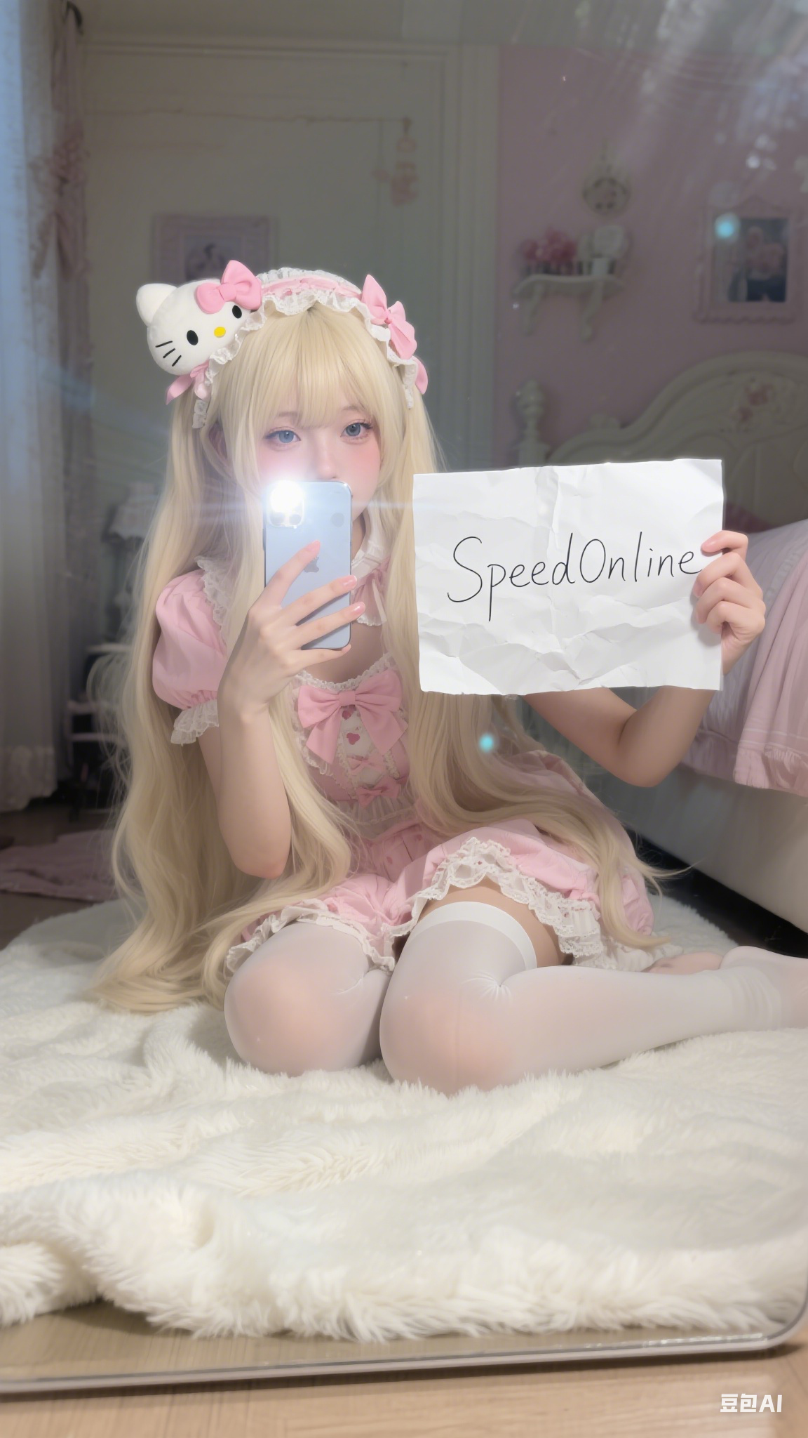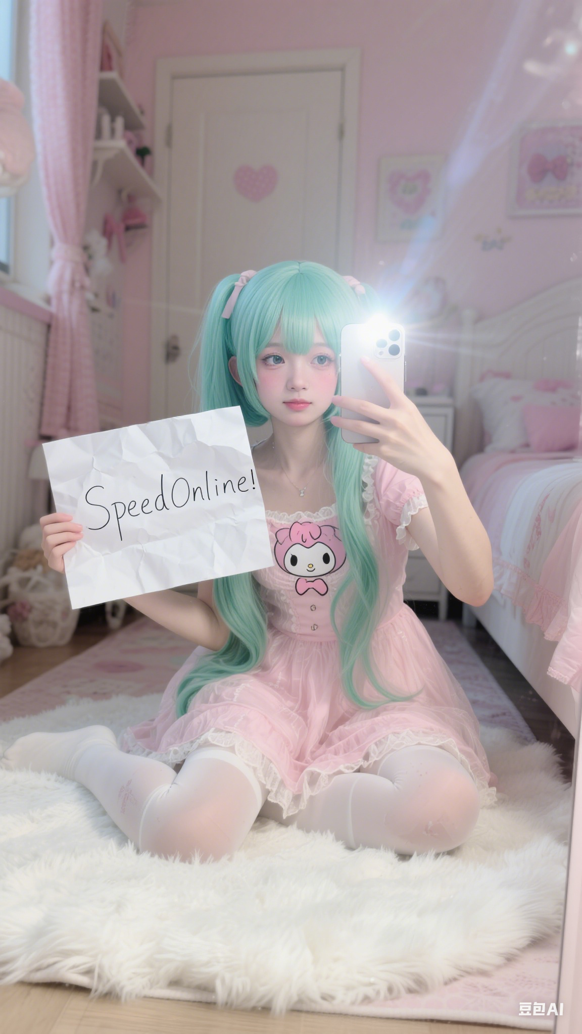 | 1 | 帮我生成一张照片,照片主题为自拍,人物手持iphone对着镜子摄影,向左蹲在地上一张白色毛茸茸的毯子上,穿着白丝,主角是穿着有粉色库洛米洛丽塔的低身高少女,浅绿色长发,头发长度到腰间,背景为精心布置少女感满满的房间,照片风格为随手一拍,但手机遮住脸部,开启了闪光灯,略带点快门速度不够导致的模糊,整体呈现出日常感,少女另一只手持一张白纸上面写着【SpeedOnline】手写字纸张略皱,整体画面呈现轻微炫光和动态模糊.比例9:16 |