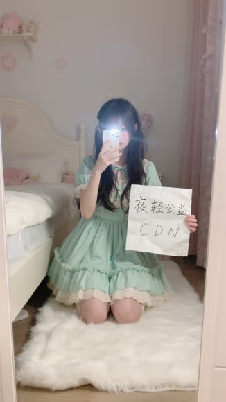 | 1 | 帮我生成一张照片,照片主题为自拍,人物手持iphone对着镜子摄影,蹲躺在床边地上一张白色毛茸茸的毯子上,轻轻依靠在床边,主角是穿着浅绿色带裙撑的洛丽塔的低身高少女,头发长度到腰间,但有些杂碎,背景为精心布置的少女感满满的房间,照片风格为随手一拍,但手机遮住脸部,开启了闪光灯,人物主体带有随意的模糊感,略带点快门速度不够导致的模糊,整体呈现出日常感,少女另一只手持一张白纸上面潦草随意的写着【夜轻公益CDN】手写字纸张略皱,整体画面呈现轻微炫光和动态模糊.比例9:16 |